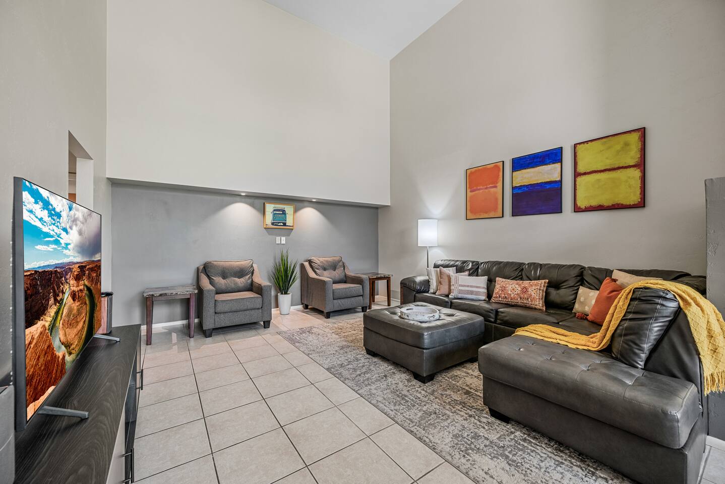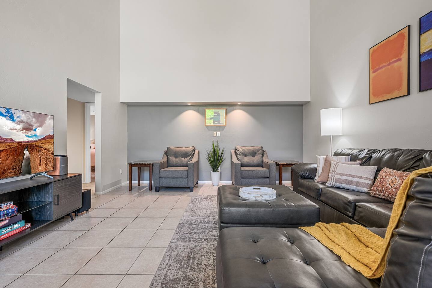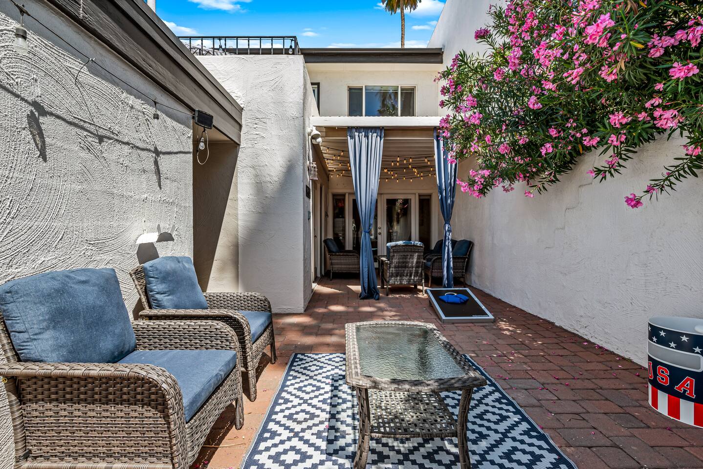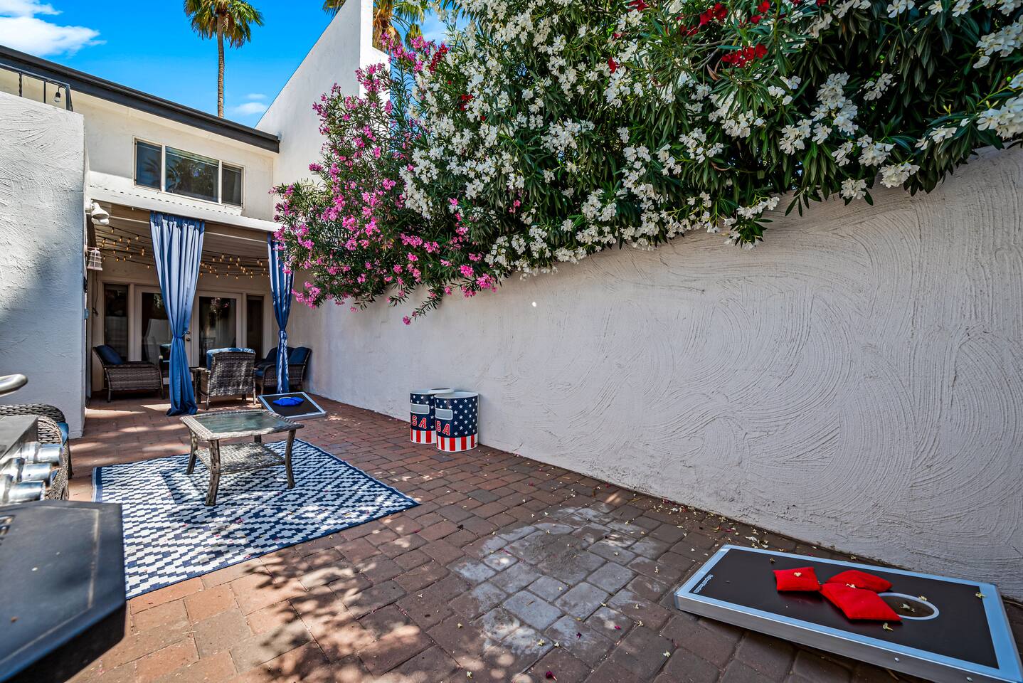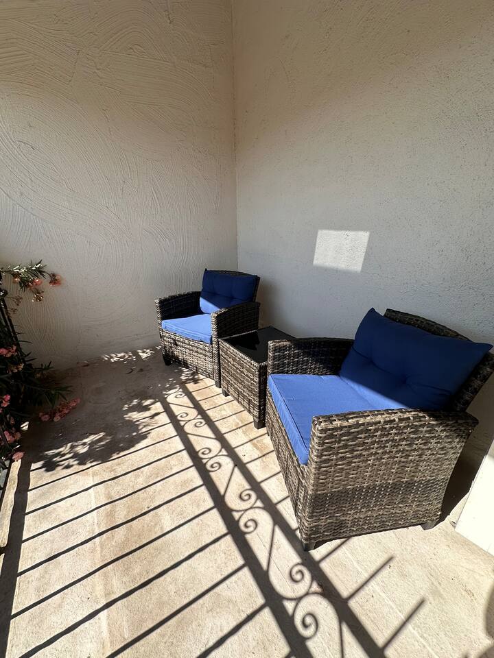 Why you’ll love our home: ✅ Unwind on our private rooftop patio with cozy seating ✅ Access to a large community pool just steps from the townhome ✅ Keep your remote work flowing with two dedicated work-from-home desks and fast, reliable Wi-Fi. ✅Extra spacious 3 bedroom and modern bathrooms with essential toiletries ✅ The kitchen is equipped with every amenity, including a Keurig, air fryer, blender, and a dishwasher to make group meal prep a breeze. ✅ Fire up the BBQ grill on the back patio and enjoy fun games including ping pong, cornhole, and Kan Jam ✅ Free parking on site in private garage and nearby community parking lot ⭐ 5 Star Reviews from our past guests: "We loved staying here, beautiful space, walking distance to almost anything you need." - Cali "We really enjoyed our stay for our girls trip, everything was great and exceeded our expectations! We would definitely recommend and would stay here again!" - Shannon "This is an amazing Airbnb and I loved how responsive the host was to all my questions. Looks beautiful inside too. I loved the multiple balconies." - Alexander SUMMARY: ✨ Bedrooms & Bathrooms ✨ This stunning 3-bed, 3-full bath townhome is designed for ultimate group comfort and privacy. Unwind in the serene second-floor primary suite featuring a plush king bed, smart TV, and a spacious walk-in closet. The private ensuite bathroom offers dual sinks, a skylight, and a separate toilet and tub/shower combo. Step onto the rooftop balcony for morning sunshine or a cozy evening under string lights. A large desk and dedicated workspace make this room ideal for remote work or study. The artsy ground-floor suite boasts a king bed, twin bed, smart TV, and a roomy walk-in closet. The updated ensuite bathroom features a large walk-in shower, dual vanities, and a separate toilet area. Additional sleeping options include a queen air mattress with a raised edge (available upon request). Extra pillows and blankets are provided for your comfort. Cozy and bright, our blue room includes a king bed with a brand-new Casper mattress, a twin bed, enclosed closet, and a dedicated desk area. Located conveniently near the entryway and kitchen, it has easy access to the main shared bathroom, complete with a full shower and amenities. ✨ Living room ✨ Our open-concept living room is designed to be the ultimate gathering space for your group. Settle in on the comfy couch with ottoman and enjoy a large 55-inch TV, perfect for movie nights. The living area connects effortlessly to the dining area, making it perfect for lounging and casual dining. ✨ Kitchen ✨ Fuel your Scottsdale getaway in our fully equipped kitchen and dedicated dining spaces, perfect for preparing and enjoying group meals. It’s packed with modern amenities including an air fryer, blender, toaster oven, Keurig and drip coffee machine, dishwasher, full-sized refrigerator, stove, and a spacious countertop for meal prep. ✨ Patio Area & Garage ✨ Extend your Arizona getaway outdoors with a private patio and game‑ready garage that lets you grill, chill, and play in style. The back patio offers covered dining and lounging, illuminated by evening string lights, with an adjustable sun screen for daytime shade. Fire up the BBQ/smoker to prepare a tasty meal for your group. Right beside the patio, the spacious garage doubles as a game room with a ping pong table, and you’ll also find a closed in washer and dryer for your convenience. These areas blend outdoor comfort and entertainment to keep your whole group happy. This is more than a place to stay. Book your 5-star experience today!