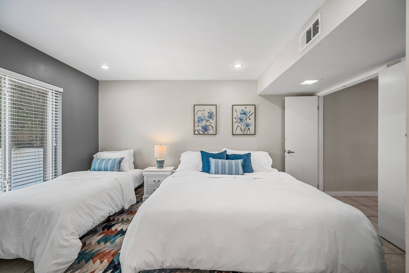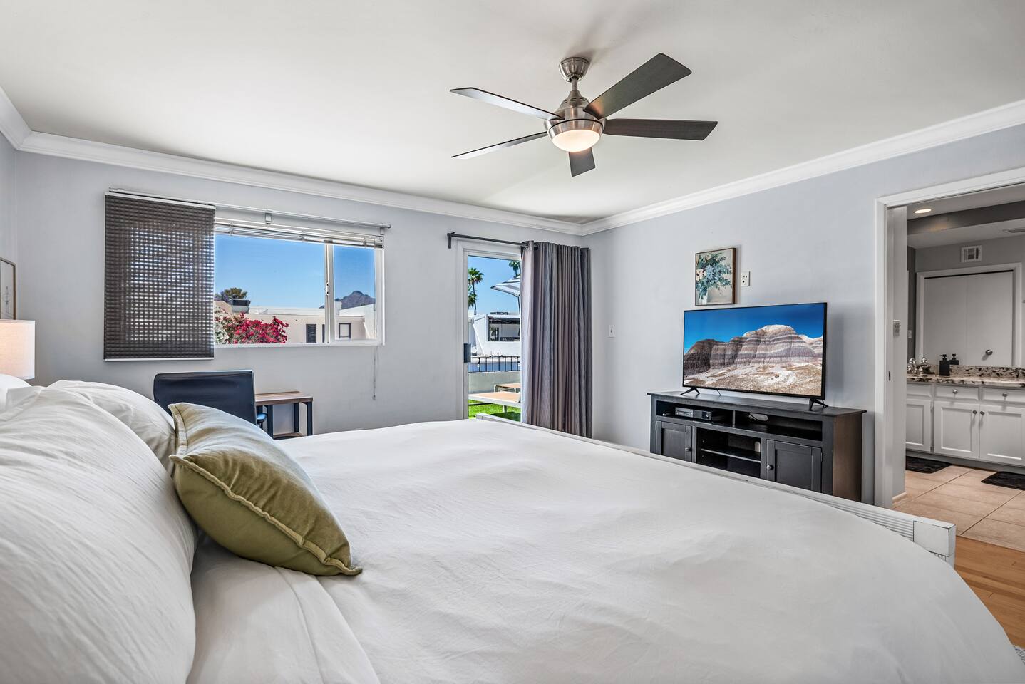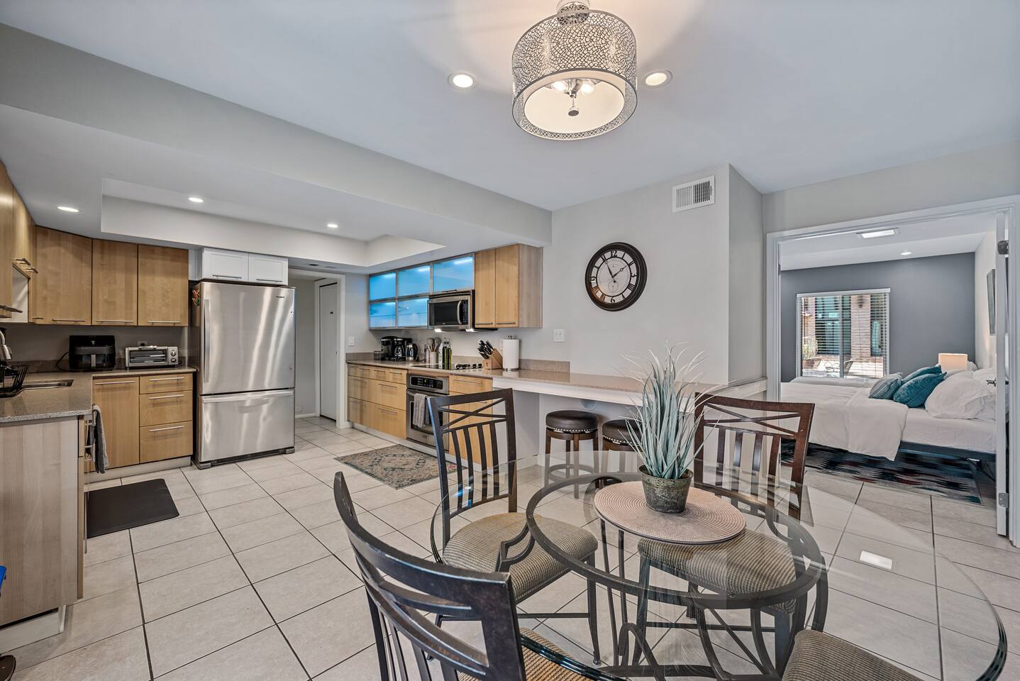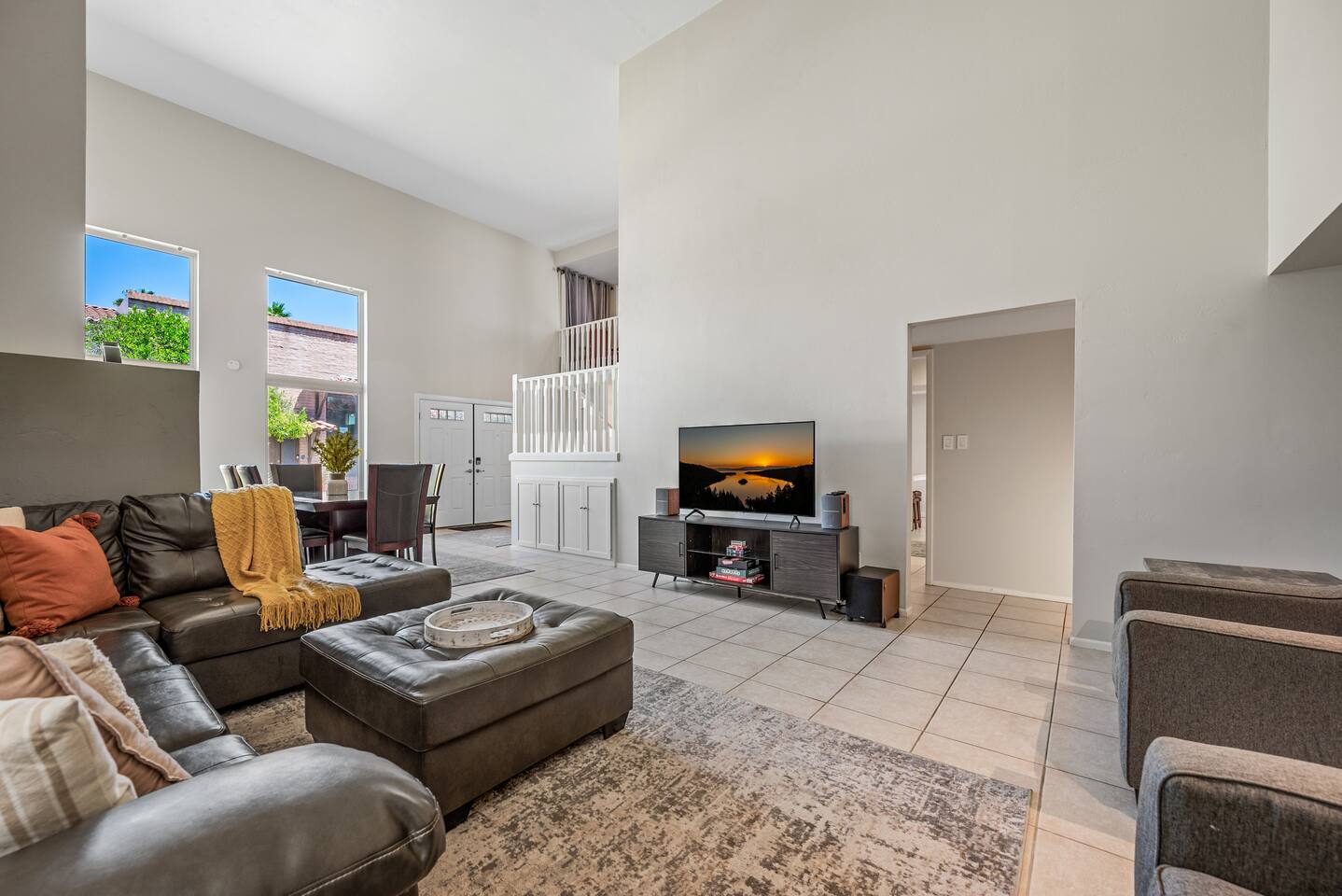 Why you’ll love our home: ✅ Unwind on our private rooftop patio with cozy seating ✅ Access to a large community pool just steps from the townhome ✅ Keep your remote work flowing with two dedicated work-from-home desks and fast, reliable Wi-Fi. ✅Extra spacious 3 bedroom and modern bathrooms with essential toiletries ✅ The kitchen is equipped with every amenity, including a Keurig, air fryer, blender, and a dishwasher to make group meal prep a breeze. ✅ Fire up the BBQ grill on the back patio and enjoy fun games including ping pong, cornhole, and Kan Jam ✅ Free parking on site in private garage and nearby community parking lot ⭐ 5 Star Reviews from our past guests: "We loved staying here, beautiful space, walking distance to almost anything you need." - Cali "We really enjoyed our stay for our girls trip, everything was great and exceeded our expectations! We would definitely recommend and would stay here again!" - Shannon "This is an amazing Airbnb and I loved how responsive the host was to all my questions. Looks beautiful inside too. I loved the multiple balconies." - Alexander SUMMARY: ✨ Bedrooms & Bathrooms ✨ This stunning 3-bed, 3-full bath townhome is designed for ultimate group comfort and privacy. Unwind in the serene second-floor primary suite featuring a plush king bed, smart TV, and a spacious walk-in closet. The private ensuite bathroom offers dual sinks, a skylight, and a separate toilet and tub/shower combo. Step onto the rooftop balcony for morning sunshine or a cozy evening under string lights. A large desk and dedicated workspace make this room ideal for remote work or study. The artsy ground-floor suite boasts a king bed, twin bed, smart TV, and a roomy walk-in closet. The updated ensuite bathroom features a large walk-in shower, dual vanities, and a separate toilet area. Additional sleeping options include a queen air mattress with a raised edge (available upon request). Extra pillows and blankets are provided for your comfort. Cozy and bright, our blue room includes a king bed with a brand-new Casper mattress, a twin bed, enclosed closet, and a dedicated desk area. Located conveniently near the entryway and kitchen, it has easy access to the main shared bathroom, complete with a full shower and amenities. ✨ Living room ✨ Our open-concept living room is designed to be the ultimate gathering space for your group. Settle in on the comfy couch with ottoman and enjoy a large 55-inch TV, perfect for movie nights. The living area connects effortlessly to the dining area, making it perfect for lounging and casual dining. ✨ Kitchen ✨ Fuel your Scottsdale getaway in our fully equipped kitchen and dedicated dining spaces, perfect for preparing and enjoying group meals. It’s packed with modern amenities including an air fryer, blender, toaster oven, Keurig and drip coffee machine, dishwasher, full-sized refrigerator, stove, and a spacious countertop for meal prep. ✨ Patio Area & Garage ✨ Extend your Arizona getaway outdoors with a private patio and game‑ready garage that lets you grill, chill, and play in style. The back patio offers covered dining and lounging, illuminated by evening string lights, with an adjustable sun screen for daytime shade. Fire up the BBQ/smoker to prepare a tasty meal for your group. Right beside the patio, the spacious garage doubles as a game room with a ping pong table, and you’ll also find a closed in washer and dryer for your convenience. These areas blend outdoor comfort and entertainment to keep your whole group happy. This is more than a place to stay. Book your 5-star experience today!