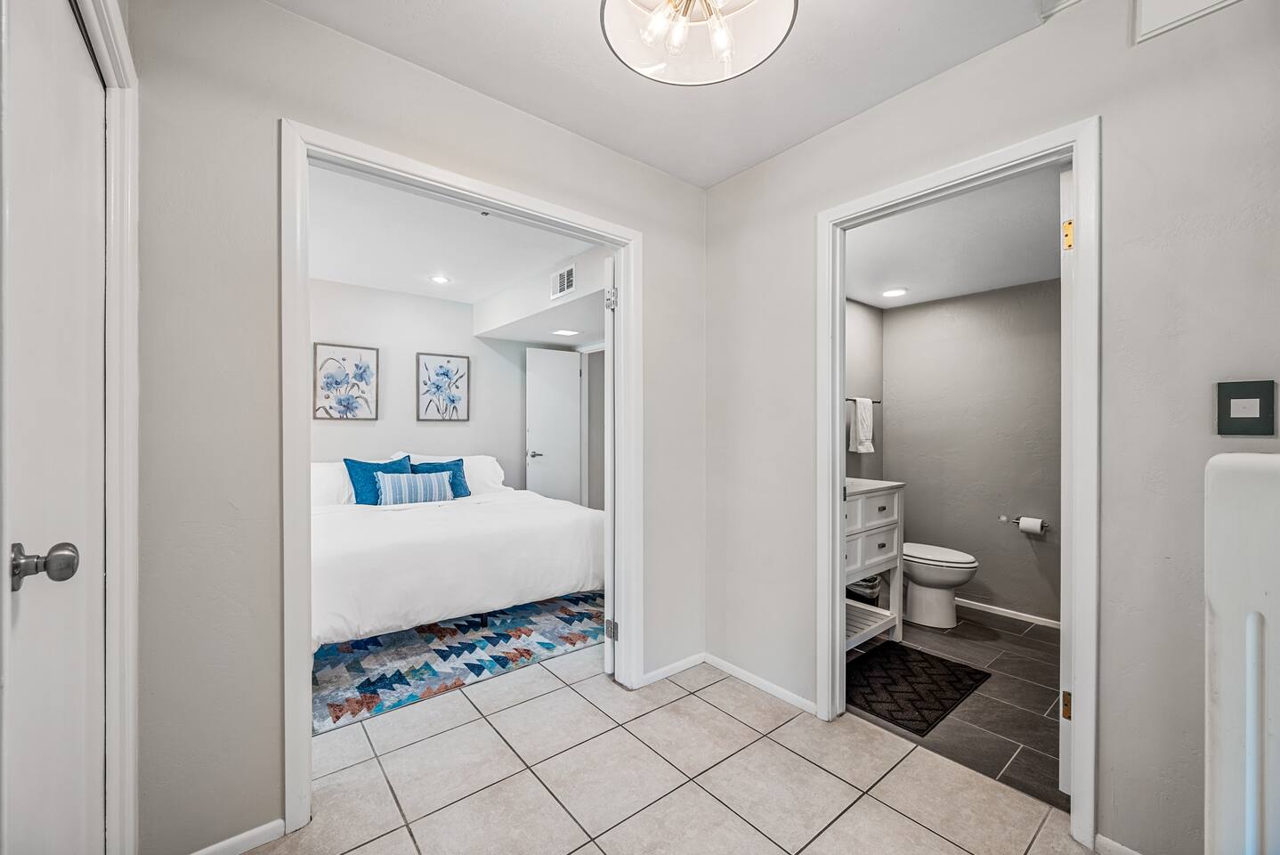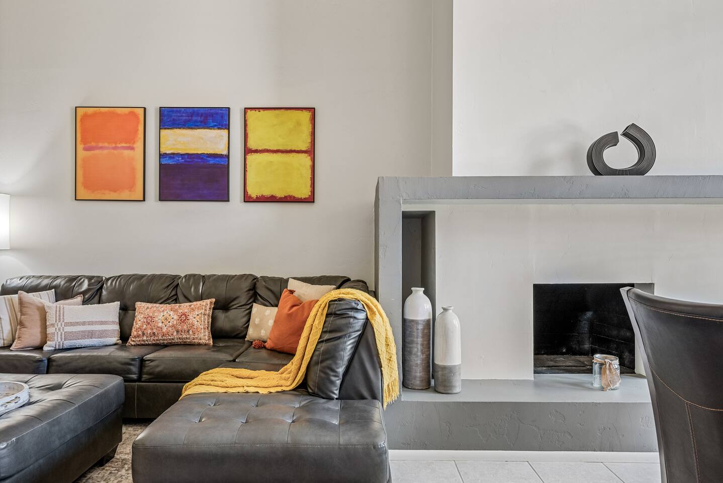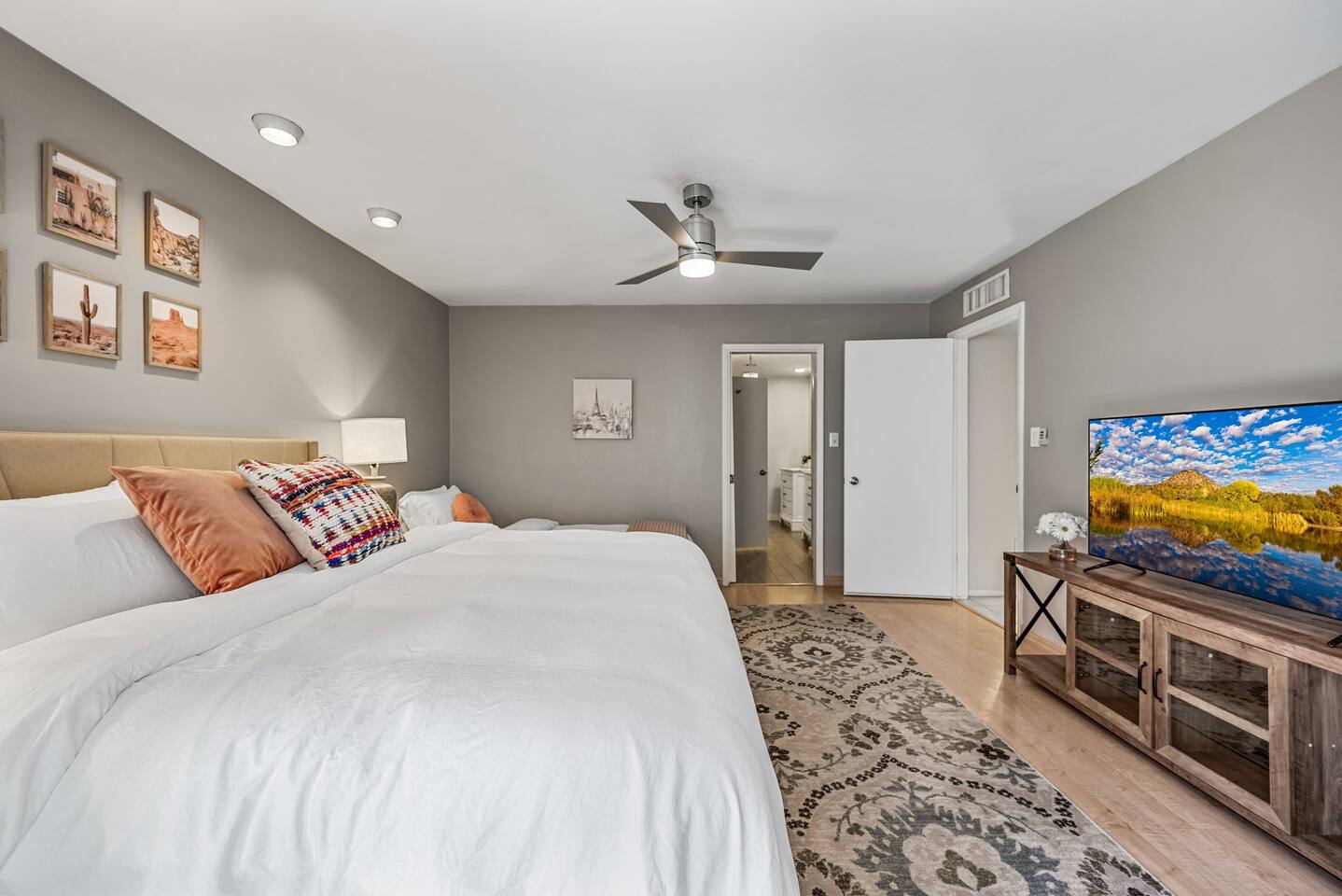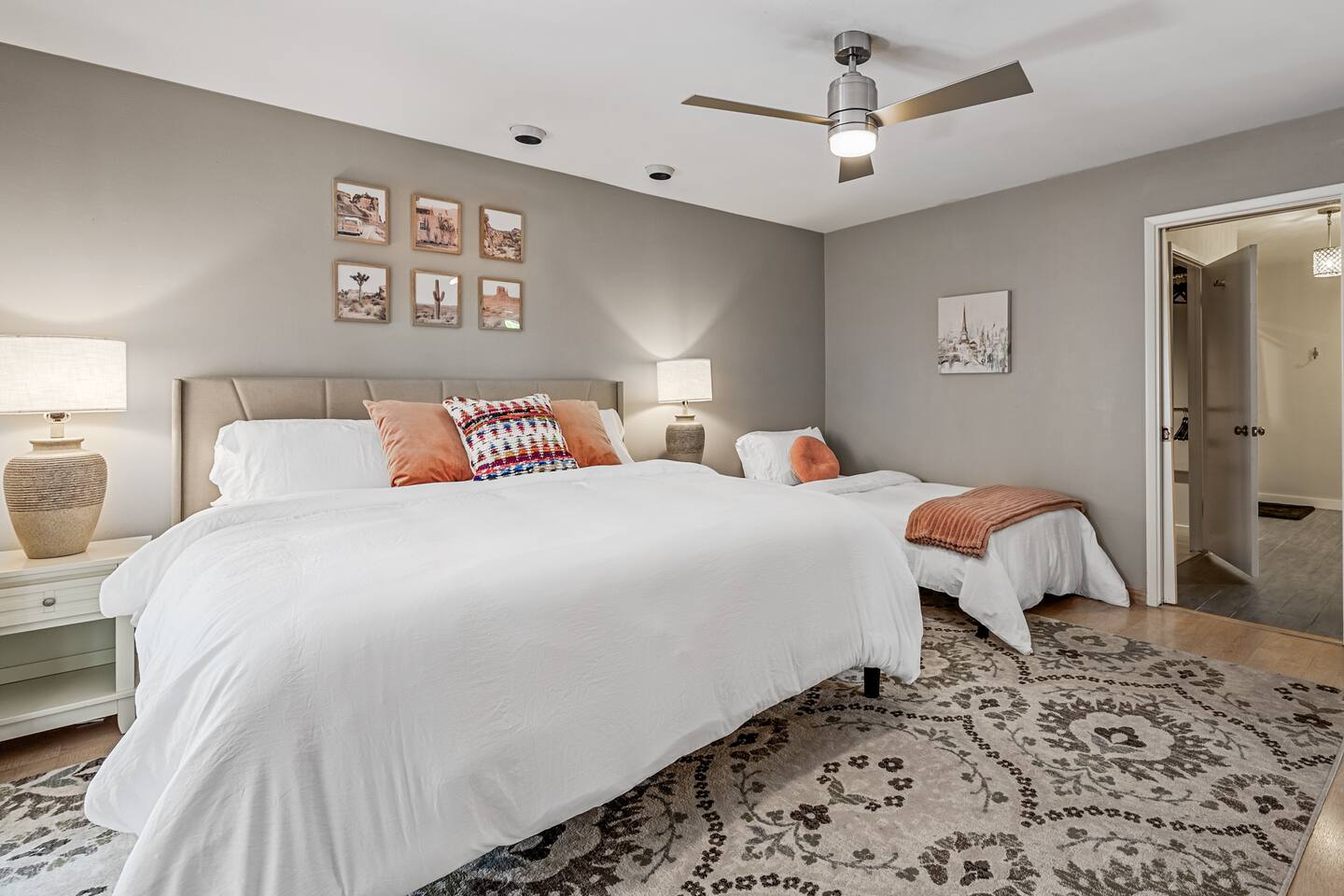 Why you’ll love our home: ✅ Unwind on our private rooftop patio with cozy seating ✅ Access to a large community pool just steps from the townhome ✅ Keep your remote work flowing with two dedicated work-from-home desks and fast, reliable Wi-Fi. ✅Extra spacious 3 bedroom and modern bathrooms with essential toiletries ✅ The kitchen is equipped with every amenity, including a Keurig, air fryer, blender, and a dishwasher to make group meal prep a breeze. ✅ Fire up the BBQ grill on the back patio and enjoy fun games including ping pong, cornhole, and Kan Jam ✅ Free parking on site in private garage and nearby community parking lot ⭐ 5 Star Reviews from our past guests: "We loved staying here, beautiful space, walking distance to almost anything you need." - Cali "We really enjoyed our stay for our girls trip, everything was great and exceeded our expectations! We would definitely recommend and would stay here again!" - Shannon "This is an amazing Airbnb and I loved how responsive the host was to all my questions. Looks beautiful inside too. I loved the multiple balconies." - Alexander SUMMARY: ✨ Bedrooms & Bathrooms ✨ This stunning 3-bed, 3-full bath townhome is designed for ultimate group comfort and privacy. Unwind in the serene second-floor primary suite featuring a plush king bed, smart TV, and a spacious walk-in closet. The private ensuite bathroom offers dual sinks, a skylight, and a separate toilet and tub/shower combo. Step onto the rooftop balcony for morning sunshine or a cozy evening under string lights. A large desk and dedicated workspace make this room ideal for remote work or study. The artsy ground-floor suite boasts a king bed, twin bed, smart TV, and a roomy walk-in closet. The updated ensuite bathroom features a large walk-in shower, dual vanities, and a separate toilet area. Additional sleeping options include a queen air mattress with a raised edge (available upon request). Extra pillows and blankets are provided for your comfort. Cozy and bright, our blue room includes a king bed with a brand-new Casper mattress, a twin bed, enclosed closet, and a dedicated desk area. Located conveniently near the entryway and kitchen, it has easy access to the main shared bathroom, complete with a full shower and amenities. ✨ Living room ✨ Our open-concept living room is designed to be the ultimate gathering space for your group. Settle in on the comfy couch with ottoman and enjoy a large 55-inch TV, perfect for movie nights. The living area connects effortlessly to the dining area, making it perfect for lounging and casual dining. ✨ Kitchen ✨ Fuel your Scottsdale getaway in our fully equipped kitchen and dedicated dining spaces, perfect for preparing and enjoying group meals. It’s packed with modern amenities including an air fryer, blender, toaster oven, Keurig and drip coffee machine, dishwasher, full-sized refrigerator, stove, and a spacious countertop for meal prep. ✨ Patio Area & Garage ✨ Extend your Arizona getaway outdoors with a private patio and game‑ready garage that lets you grill, chill, and play in style. The back patio offers covered dining and lounging, illuminated by evening string lights, with an adjustable sun screen for daytime shade. Fire up the BBQ/smoker to prepare a tasty meal for your group. Right beside the patio, the spacious garage doubles as a game room with a ping pong table, and you’ll also find a closed in washer and dryer for your convenience. These areas blend outdoor comfort and entertainment to keep your whole group happy. This is more than a place to stay. Book your 5-star experience today!