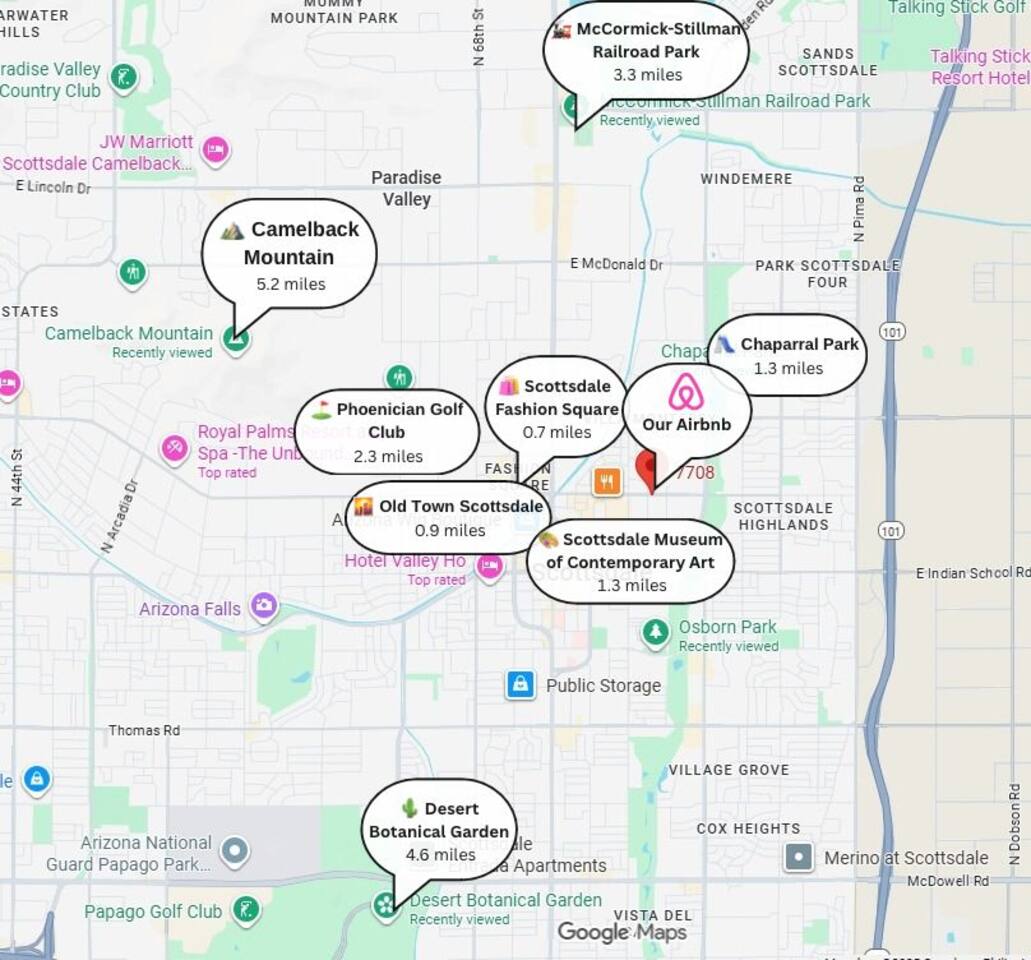 Your stay at 7708 E Camelback Rd places you in a desirable Camelback / Arcadia–adjacent corridor, offering a refined balance of residential tranquility with access to Scottsdale’s cultural, shopping, dining, and outdoor attractions. Nearby Gems & Must-Visits ◉ Scottsdale Fashion Square – ~5–10 min drive | The premier luxury shopping mall in Scottsdale with high-end retailers, dining, and entertainment. ◉ Old Town Scottsdale / Downtown Scottsdale – ~10 min drive | Galleries, nightlife, restaurants, art walks & local events ◉ McCormick-Stillman Railroad Park – ~8–12 min drive | A charming 30-acre park with trains, playgrounds, mini railroad & railroad museum ◉ McDowell Sonoran Preserve – ~15 min drive (depending on trailhead) | Vast desert landscapes, hiking, biking & nature immersion ◉ SMoCA (Scottsdale Museum of Contemporary Art) – ~10 min drive | Contemporary art, design & architecture in the heart of Scottsdale ◉ Camelback Mountain | One of the iconic hiking/photography landmarks in Phoenix/Scottsdale region, offering scenic views and outdoor adventure Local Delights & Lifestyle Spots ◉ Arcadia neighborhood – directly nearby | Tree-lined streets, historic character, close to Camelback & the canal area ◉ Boutiques, cafés & galleries in Camelback Corridor & Old Town — easy to hop in for brunch, coffee, local art & casual strolling ◉ Spa + Wellness, Golf, & Outdoor Amenities — Scottsdale excels in high quality spas, wellness centers, and world-class golf courses in the broader area Shopping & Convenience ◉ Luxury & Retail – Scottsdale Fashion Square is your closest major retail hub. ◉ Everyday Amenities – Grocery stores, cafés, fitness studios, and local services are accessible within short drives along Camelback or through Old Town ◉ Transit / Access – Convenient access to Phoenix / Scottsdale roads to reach Phoenix Sky Harbor, Tempe, and broader metro area