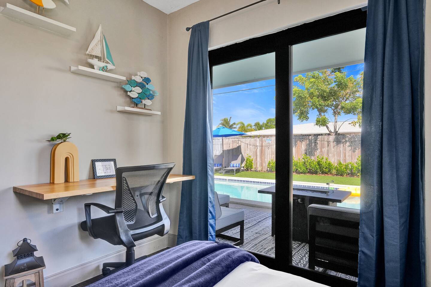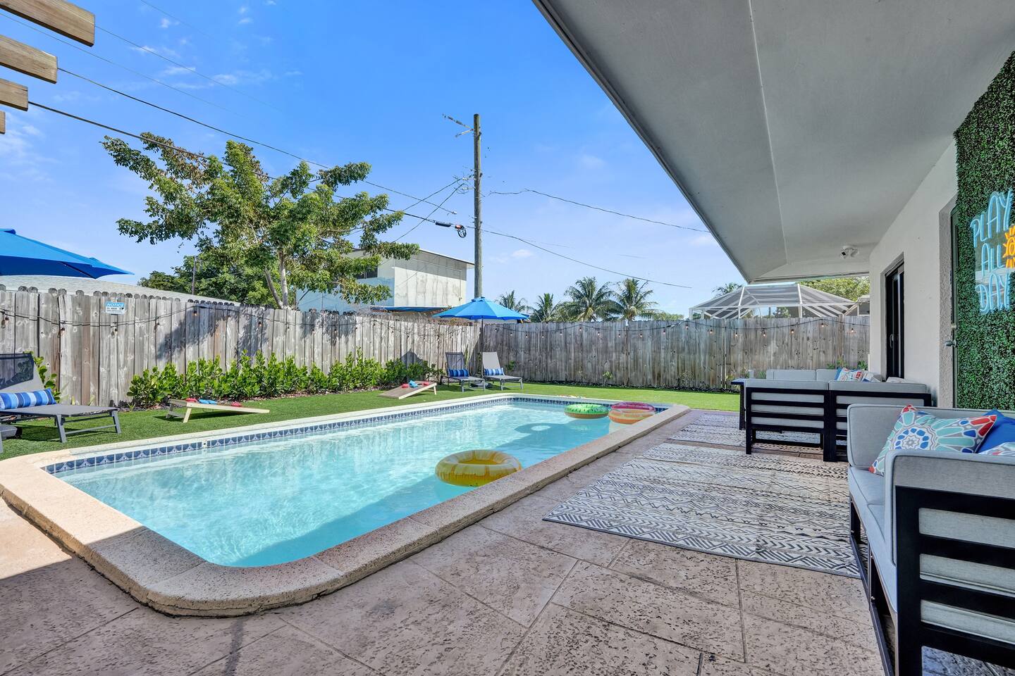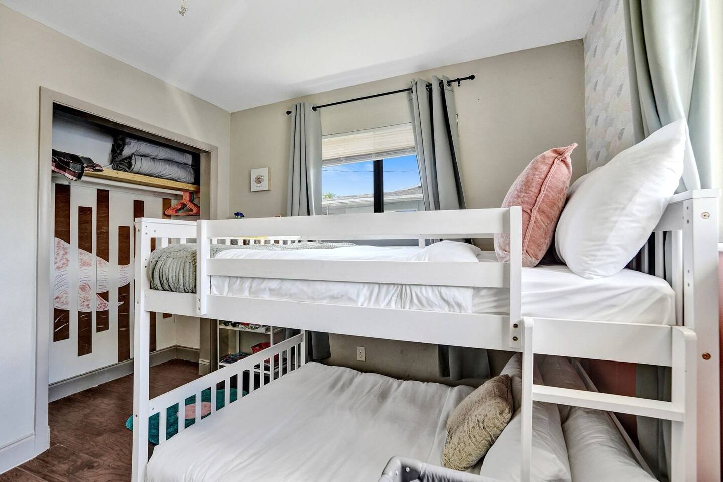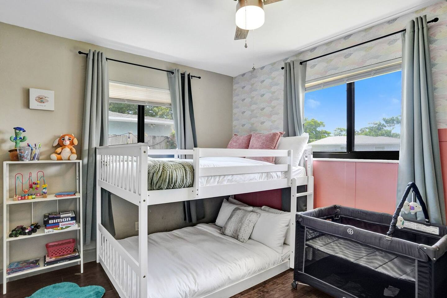 🌴 Why families and friends love our home: ✅ Private backyard oasis – large pool, sun loungers, umbrellas & outdoor dining ✅ Evening fire table lounge area – the perfect spot for s’mores, cuddling up by the fire or catching up on the comfortable couches, all under a covered roof ✅ Playful interiors – colorful coastal themed bedrooms, cozy textures, and cheerful décor ✅ Kid-friendly amenities – Pack ’n Play, high chair, toys, games & pool floats ✅ Fully equipped kitchen with plenty of counter space for easy family meals ✅ Three parking spaces on site, including one covered ✅ Smart TV & comfy sectional couch and swivel chairs for lounging and movie nights ✅ Fast WiFi for streaming and remote work if needed, with 2 working stations included ✨ Bedrooms & Bathrooms This home was made for families and friends, each room bringing its own charm, theme, and story to tell. Each ones comes with plenty of natural light with dual windows, blackout blinds and ceiling fans making for comfortable sleeps. 🏝️ Primary Suite – Coastal Calm Queen bed, ensuite connected bathroom, and private access to the backyard dining and pool area. Wake up to natural light and a backyard views for the perfect start to your day. 🌿 Boho Retreat – Warm & Welcoming Queen bed, ensuite connected bathroom, and lots of natural light makes it ideal for friends or couples joining the family trip. The closet includes plenty of clothing storage, extra linens, a portable fan with temperature settings and an exercise mat making in-house or backyard workouts more comfortable. 🐚 Sea Room – Tropical Blues Double bed with a workstation and private door access to the fire table lounge and pool area. There’s plenty of clothing storage in the 6-drawer dresser and closet with a hanging shelf that allows you to unpack and feel at home. Ocean-inspired wallpaper, beachy décor, and blackout blinds make it a peaceful, playful retreat. 🌈 Kids’ Paradise – Fun & Cozy Full-over-full bunk bed, plush emerald green sofa bed, toys, games, and a Pack ’n Play with bassinet option. Soft pink and coral accents create a cheerful vibe that kids adore in addition to having their own private play space. Both full bathrooms are stocked with shampoo, conditioner, body wash and hair dryers. The main bathroom includes a stand-up shower, dual sinks, modern fixtures, and direct pool access for easy pre- and post-swim rinses. The second bathroom connecting the two Queen bedrooms have a bath/shower combination with a fogged window for plenty of light, and lots of storage under the vanity. 🛋️ Living Room Bright, open, and full of personality, perfect for gathering after a day at the beach or around the pool! The spacious living area features a comfy sectional, two swivel lounge chairs, a smart TV and Bluetooth soundbar. Modern art and cozy textiles bring a pop of joy to every corner, while large windows fill the space with Florida sunshine, with the option of blackout blinds for movie nights. 🍳 Kitchen & Dining Cook, laugh, and eat together in the open-concept kitchen and dining area. You’ll find everything you need: • Stainless-steel appliances & countertop wine fridge • Coffee & tea lovers’ setup (Keurig, drip & electric kettle) • Blender, toaster, air fryer, cookware & kid-friendly dishware • Starter pantry essentials (salt, pepper, oil, & spices) Enjoy meals at the dining table or head outside for poolside dining under the pergola, shaded or not, it’s your choice! 🌞 Outdoor Oasis Step into your private backyard paradise — where every day feels like summer vacation. 💦 Swim in the crystal-clear, large pool under the sun 🔥 Relax by the fire table with comfy outdoor sofas under a covered roof 🍔 Grill & dine under the pergola 🌴 Play lawn games or lounge in the sun 🎯 Float and play with colorful pool toys and outdoor family games The backyard is fully fenced for privacy and peace of mind, giving kids space to play safely while parents unwind. 📍 Local Highlights: ⛳ Pompano Beach Golf Course – lush greens and ocean breezes (8min) 🌳 Pompano Community Park – playgrounds, courts, and walking trails (8min) 🏖️ Pompano Beach Pier – family-friendly restaurants, live music, and sunset views (10min) 🍦 Kilwins Ice Cream & Chocolate – a local favorite for an after-dinner treat 🛍️ Shops & Cafés – everything you need within a short drive 🚗 Parking & Access Three parking spaces, including one covered carport. Smart lock check-in for a smooth, contactless arrival. 💬 The Vibe Play all day. Rest all night. This isn’t just a vacation home. It’s a place where families and friends can reconnect, relax and enjoy every sunset by the pool which becomes a memory never forgotten. Book your stay at the Pompano Family Oasis today and start your next great family story. 🌞