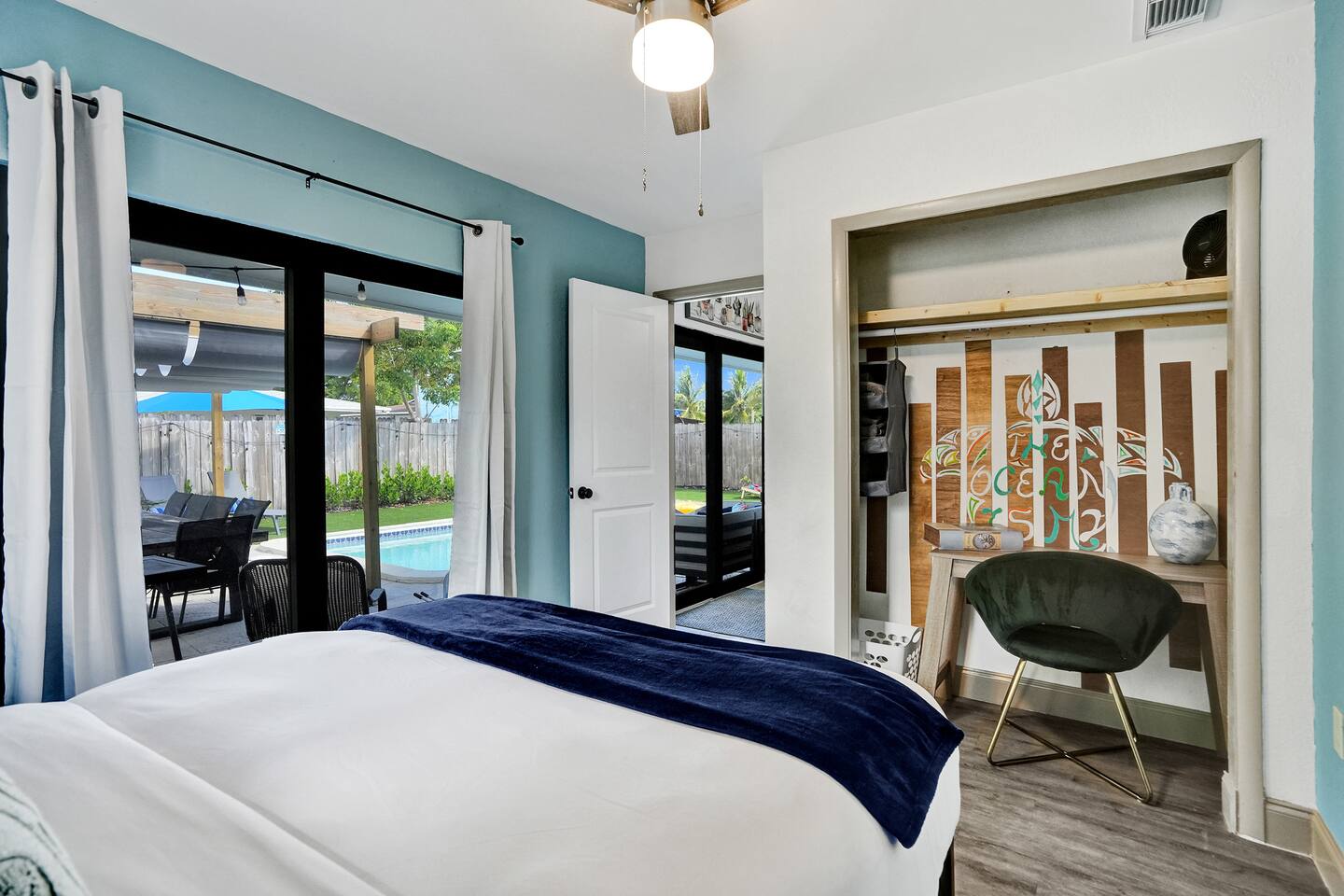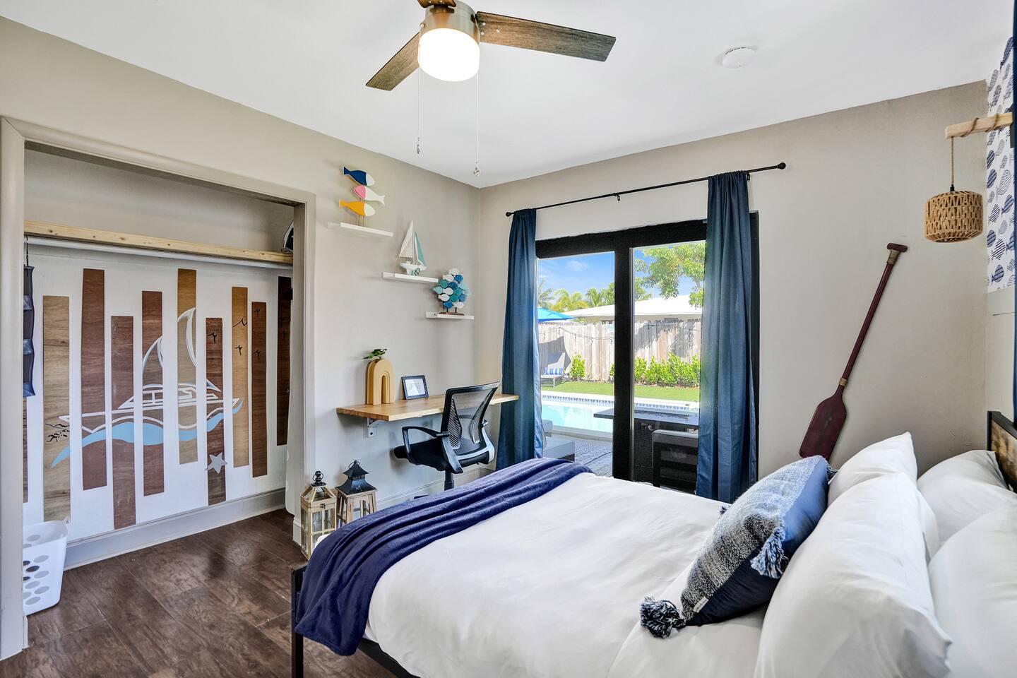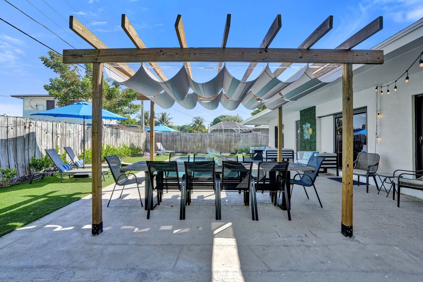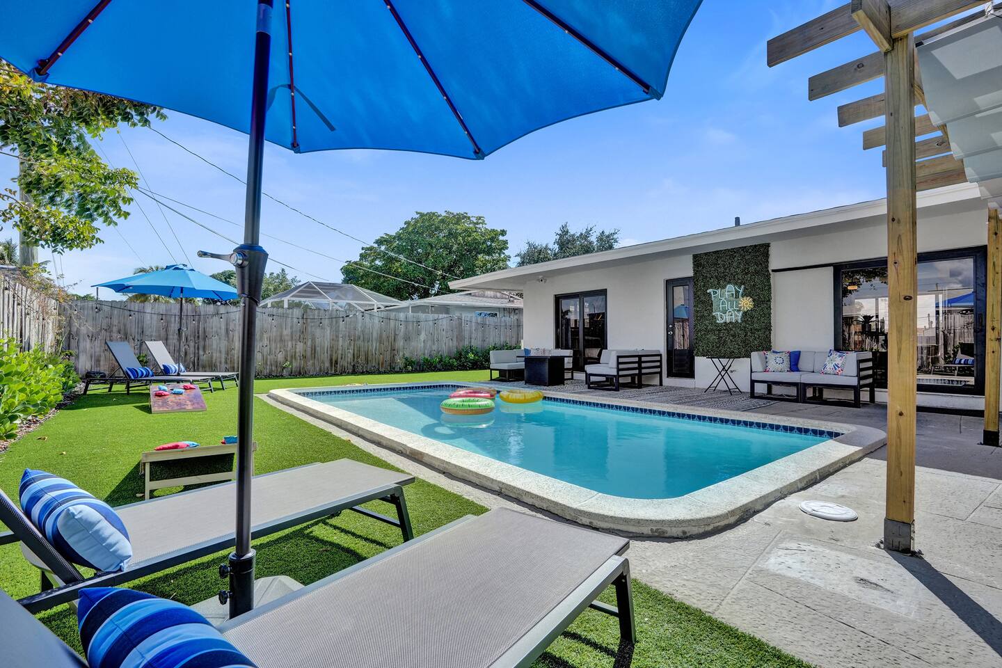 🌴 Why families and friends love our home: ✅ Private backyard oasis – large pool, sun loungers, umbrellas & outdoor dining ✅ Evening fire table lounge area – the perfect spot for s’mores, cuddling up by the fire or catching up on the comfortable couches, all under a covered roof ✅ Playful interiors – colorful coastal themed bedrooms, cozy textures, and cheerful décor ✅ Kid-friendly amenities – Pack ’n Play, high chair, toys, games & pool floats ✅ Fully equipped kitchen with plenty of counter space for easy family meals ✅ Three parking spaces on site, including one covered ✅ Smart TV & comfy sectional couch and swivel chairs for lounging and movie nights ✅ Fast WiFi for streaming and remote work if needed, with 2 working stations included ✨ Bedrooms & Bathrooms This home was made for families and friends, each room bringing its own charm, theme, and story to tell. Each ones comes with plenty of natural light with dual windows, blackout blinds and ceiling fans making for comfortable sleeps. 🏝️ Primary Suite – Coastal Calm Queen bed, ensuite connected bathroom, and private access to the backyard dining and pool area. Wake up to natural light and a backyard views for the perfect start to your day. 🌿 Boho Retreat – Warm & Welcoming Queen bed, ensuite connected bathroom, and lots of natural light makes it ideal for friends or couples joining the family trip. The closet includes plenty of clothing storage, extra linens, a portable fan with temperature settings and an exercise mat making in-house or backyard workouts more comfortable. 🐚 Sea Room – Tropical Blues Double bed with a workstation and private door access to the fire table lounge and pool area. There’s plenty of clothing storage in the 6-drawer dresser and closet with a hanging shelf that allows you to unpack and feel at home. Ocean-inspired wallpaper, beachy décor, and blackout blinds make it a peaceful, playful retreat. 🌈 Kids’ Paradise – Fun & Cozy Full-over-full bunk bed, plush emerald green sofa bed, toys, games, and a Pack ’n Play with bassinet option. Soft pink and coral accents create a cheerful vibe that kids adore in addition to having their own private play space. Both full bathrooms are stocked with shampoo, conditioner, body wash and hair dryers. The main bathroom includes a stand-up shower, dual sinks, modern fixtures, and direct pool access for easy pre- and post-swim rinses. The second bathroom connecting the two Queen bedrooms have a bath/shower combination with a fogged window for plenty of light, and lots of storage under the vanity. 🛋️ Living Room Bright, open, and full of personality, perfect for gathering after a day at the beach or around the pool! The spacious living area features a comfy sectional, two swivel lounge chairs, a smart TV and Bluetooth soundbar. Modern art and cozy textiles bring a pop of joy to every corner, while large windows fill the space with Florida sunshine, with the option of blackout blinds for movie nights. 🍳 Kitchen & Dining Cook, laugh, and eat together in the open-concept kitchen and dining area. You’ll find everything you need: • Stainless-steel appliances & countertop wine fridge • Coffee & tea lovers’ setup (Keurig, drip & electric kettle) • Blender, toaster, air fryer, cookware & kid-friendly dishware • Starter pantry essentials (salt, pepper, oil, & spices) Enjoy meals at the dining table or head outside for poolside dining under the pergola, shaded or not, it’s your choice! 🌞 Outdoor Oasis Step into your private backyard paradise — where every day feels like summer vacation. 💦 Swim in the crystal-clear, large pool under the sun 🔥 Relax by the fire table with comfy outdoor sofas under a covered roof 🍔 Grill & dine under the pergola 🌴 Play lawn games or lounge in the sun 🎯 Float and play with colorful pool toys and outdoor family games The backyard is fully fenced for privacy and peace of mind, giving kids space to play safely while parents unwind. 📍 Local Highlights: ⛳ Pompano Beach Golf Course – lush greens and ocean breezes (8min) 🌳 Pompano Community Park – playgrounds, courts, and walking trails (8min) 🏖️ Pompano Beach Pier – family-friendly restaurants, live music, and sunset views (10min) 🍦 Kilwins Ice Cream & Chocolate – a local favorite for an after-dinner treat 🛍️ Shops & Cafés – everything you need within a short drive 🚗 Parking & Access Three parking spaces, including one covered carport. Smart lock check-in for a smooth, contactless arrival. 💬 The Vibe Play all day. Rest all night. This isn’t just a vacation home. It’s a place where families and friends can reconnect, relax and enjoy every sunset by the pool which becomes a memory never forgotten. Book your stay at the Pompano Family Oasis today and start your next great family story. 🌞