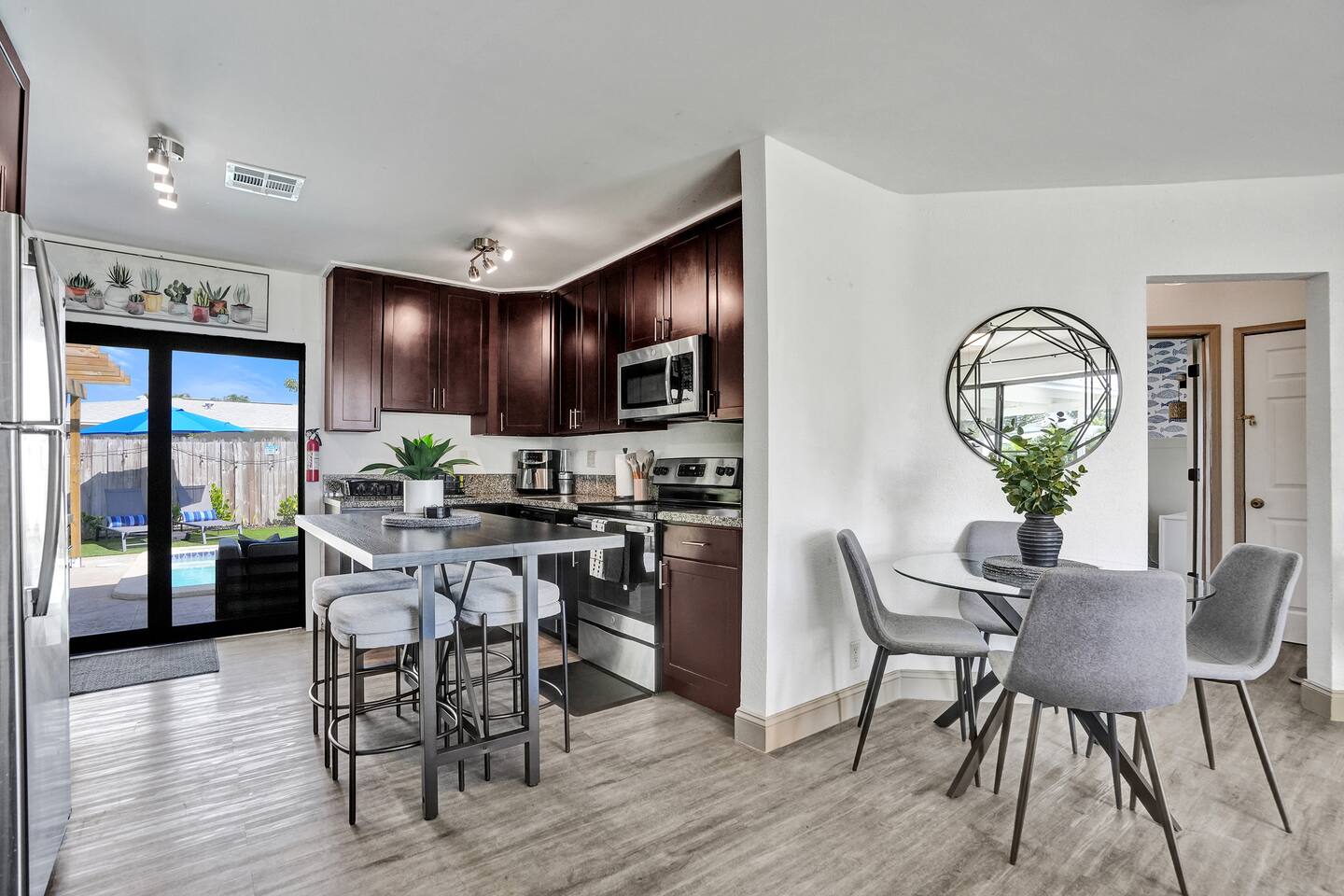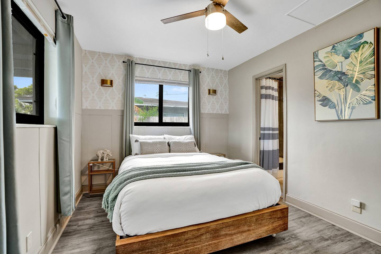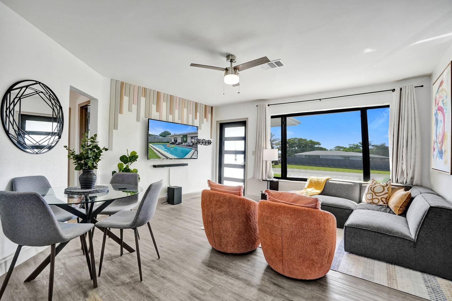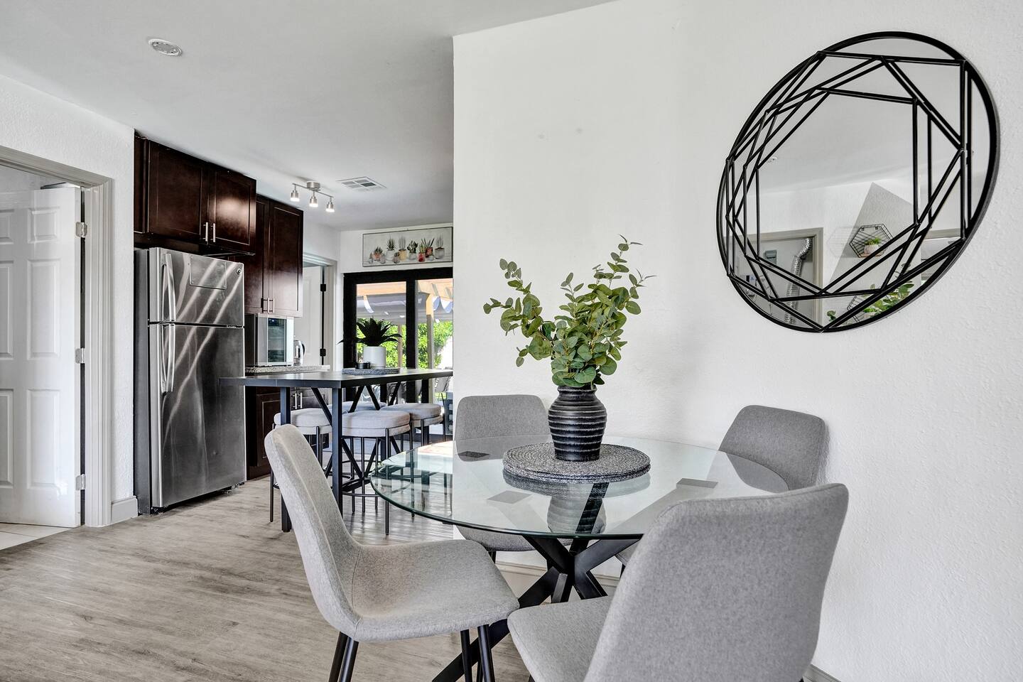 🌴 Why families and friends love our home: ✅ Private backyard oasis – large pool, sun loungers, umbrellas & outdoor dining ✅ Evening fire table lounge area – the perfect spot for s’mores, cuddling up by the fire or catching up on the comfortable couches, all under a covered roof ✅ Playful interiors – colorful coastal themed bedrooms, cozy textures, and cheerful décor ✅ Kid-friendly amenities – Pack ’n Play, high chair, toys, games & pool floats ✅ Fully equipped kitchen with plenty of counter space for easy family meals ✅ Three parking spaces on site, including one covered ✅ Smart TV & comfy sectional couch and swivel chairs for lounging and movie nights ✅ Fast WiFi for streaming and remote work if needed, with 2 working stations included ✨ Bedrooms & Bathrooms This home was made for families and friends, each room bringing its own charm, theme, and story to tell. Each ones comes with plenty of natural light with dual windows, blackout blinds and ceiling fans making for comfortable sleeps. 🏝️ Primary Suite – Coastal Calm Queen bed, ensuite connected bathroom, and private access to the backyard dining and pool area. Wake up to natural light and a backyard views for the perfect start to your day. 🌿 Boho Retreat – Warm & Welcoming Queen bed, ensuite connected bathroom, and lots of natural light makes it ideal for friends or couples joining the family trip. The closet includes plenty of clothing storage, extra linens, a portable fan with temperature settings and an exercise mat making in-house or backyard workouts more comfortable. 🐚 Sea Room – Tropical Blues Double bed with a workstation and private door access to the fire table lounge and pool area. There’s plenty of clothing storage in the 6-drawer dresser and closet with a hanging shelf that allows you to unpack and feel at home. Ocean-inspired wallpaper, beachy décor, and blackout blinds make it a peaceful, playful retreat. 🌈 Kids’ Paradise – Fun & Cozy Full-over-full bunk bed, plush emerald green sofa bed, toys, games, and a Pack ’n Play with bassinet option. Soft pink and coral accents create a cheerful vibe that kids adore in addition to having their own private play space. Both full bathrooms are stocked with shampoo, conditioner, body wash and hair dryers. The main bathroom includes a stand-up shower, dual sinks, modern fixtures, and direct pool access for easy pre- and post-swim rinses. The second bathroom connecting the two Queen bedrooms have a bath/shower combination with a fogged window for plenty of light, and lots of storage under the vanity. 🛋️ Living Room Bright, open, and full of personality, perfect for gathering after a day at the beach or around the pool! The spacious living area features a comfy sectional, two swivel lounge chairs, a smart TV and Bluetooth soundbar. Modern art and cozy textiles bring a pop of joy to every corner, while large windows fill the space with Florida sunshine, with the option of blackout blinds for movie nights. 🍳 Kitchen & Dining Cook, laugh, and eat together in the open-concept kitchen and dining area. You’ll find everything you need: • Stainless-steel appliances & countertop wine fridge • Coffee & tea lovers’ setup (Keurig, drip & electric kettle) • Blender, toaster, air fryer, cookware & kid-friendly dishware • Starter pantry essentials (salt, pepper, oil, & spices) Enjoy meals at the dining table or head outside for poolside dining under the pergola, shaded or not, it’s your choice! 🌞 Outdoor Oasis Step into your private backyard paradise — where every day feels like summer vacation. 💦 Swim in the crystal-clear, large pool under the sun 🔥 Relax by the fire table with comfy outdoor sofas under a covered roof 🍔 Grill & dine under the pergola 🌴 Play lawn games or lounge in the sun 🎯 Float and play with colorful pool toys and outdoor family games The backyard is fully fenced for privacy and peace of mind, giving kids space to play safely while parents unwind. 📍 Local Highlights: ⛳ Pompano Beach Golf Course – lush greens and ocean breezes (8min) 🌳 Pompano Community Park – playgrounds, courts, and walking trails (8min) 🏖️ Pompano Beach Pier – family-friendly restaurants, live music, and sunset views (10min) 🍦 Kilwins Ice Cream & Chocolate – a local favorite for an after-dinner treat 🛍️ Shops & Cafés – everything you need within a short drive 🚗 Parking & Access Three parking spaces, including one covered carport. Smart lock check-in for a smooth, contactless arrival. 💬 The Vibe Play all day. Rest all night. This isn’t just a vacation home. It’s a place where families and friends can reconnect, relax and enjoy every sunset by the pool which becomes a memory never forgotten. Book your stay at the Pompano Family Oasis today and start your next great family story. 🌞