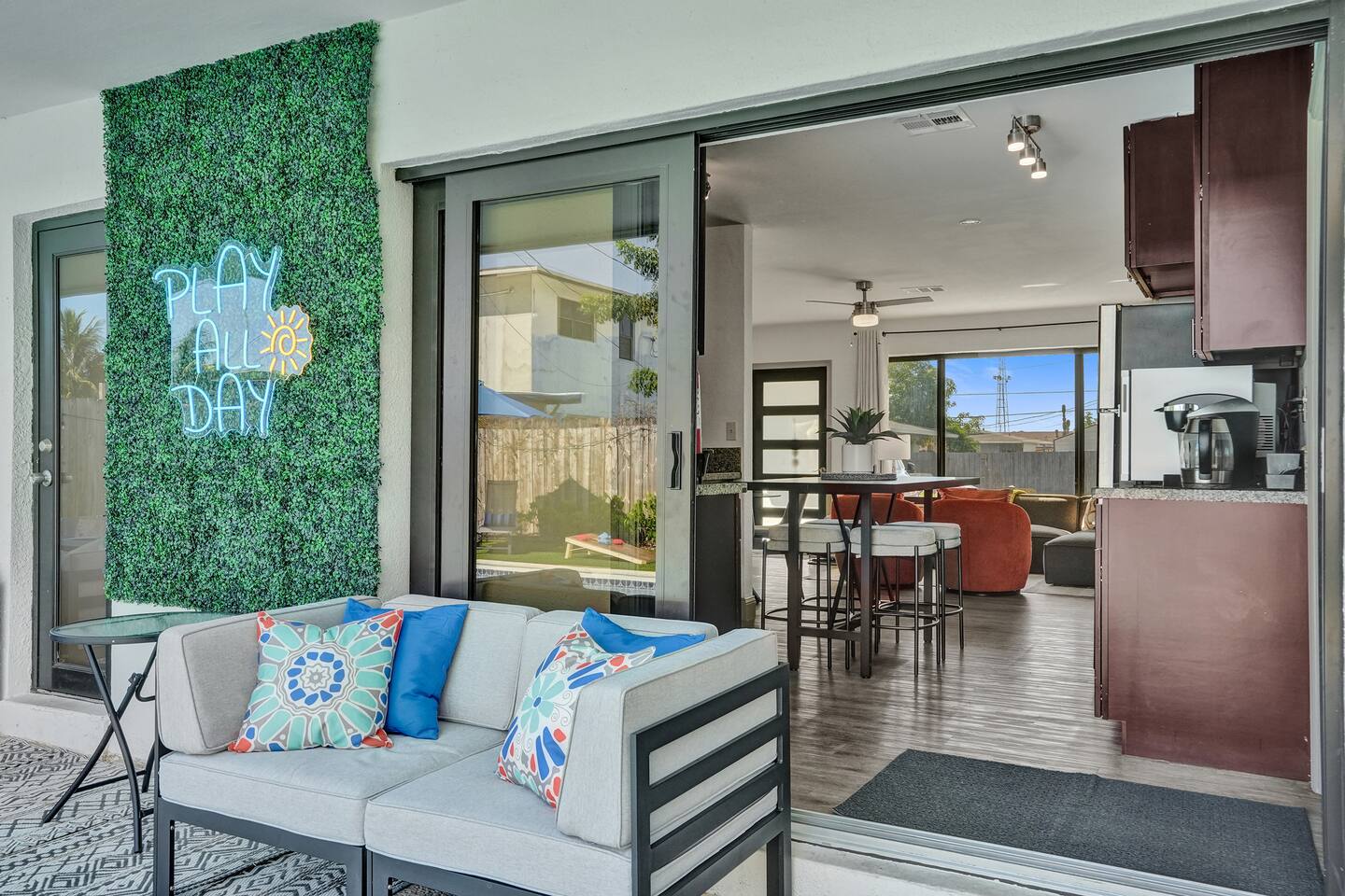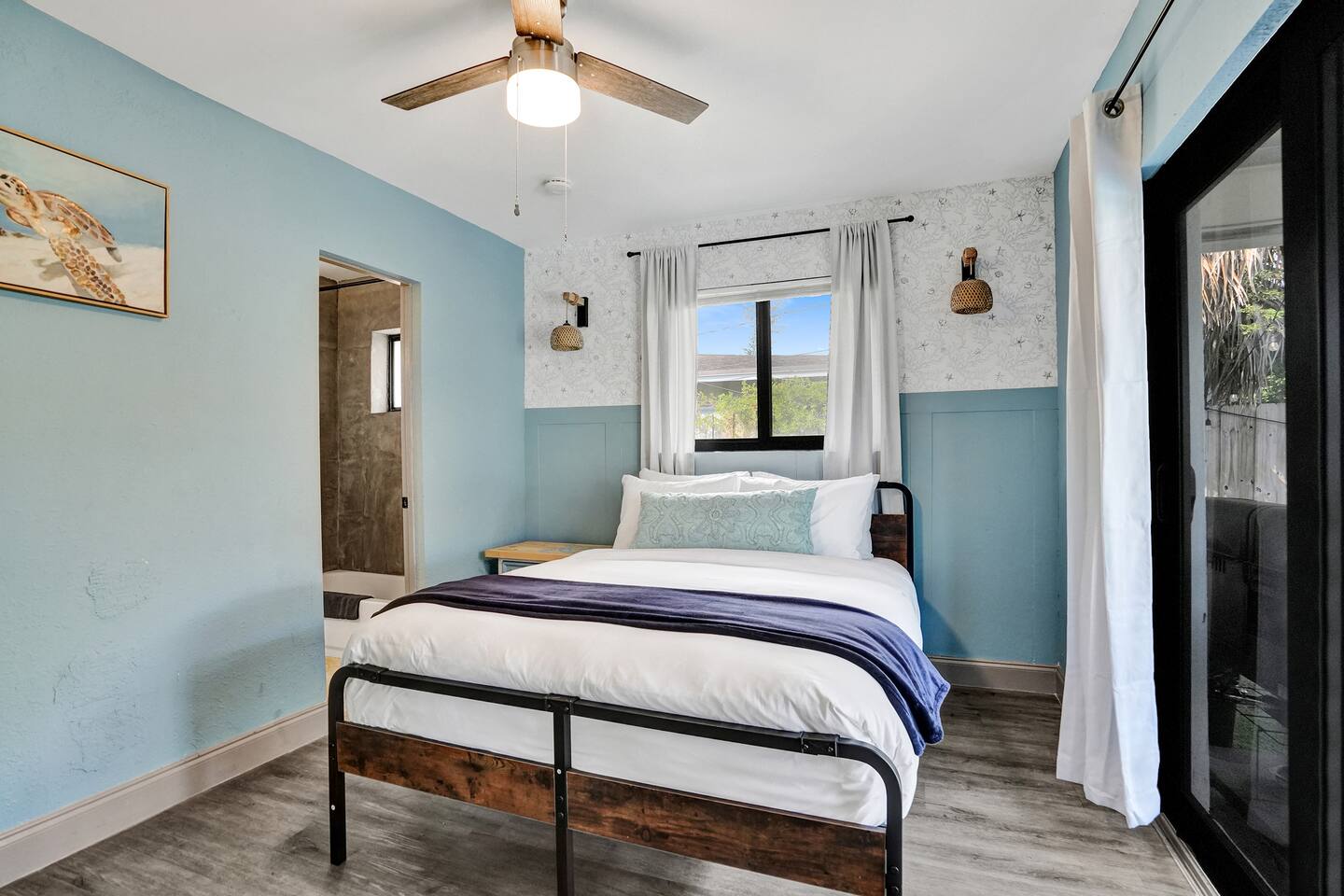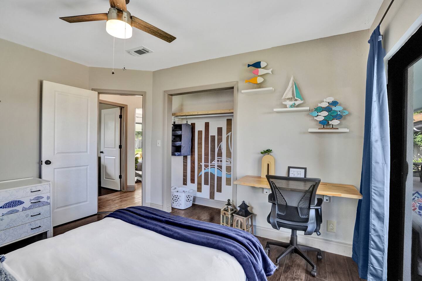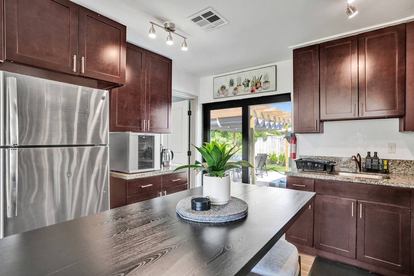 🌴 Why families and friends love our home: ✅ Private backyard oasis – large pool, sun loungers, umbrellas & outdoor dining ✅ Evening fire table lounge area – the perfect spot for s’mores, cuddling up by the fire or catching up on the comfortable couches, all under a covered roof ✅ Playful interiors – colorful coastal themed bedrooms, cozy textures, and cheerful décor ✅ Kid-friendly amenities – Pack ’n Play, high chair, toys, games & pool floats ✅ Fully equipped kitchen with plenty of counter space for easy family meals ✅ Three parking spaces on site, including one covered ✅ Smart TV & comfy sectional couch and swivel chairs for lounging and movie nights ✅ Fast WiFi for streaming and remote work if needed, with 2 working stations included ✨ Bedrooms & Bathrooms This home was made for families and friends, each room bringing its own charm, theme, and story to tell. Each ones comes with plenty of natural light with dual windows, blackout blinds and ceiling fans making for comfortable sleeps. 🏝️ Primary Suite – Coastal Calm Queen bed, ensuite connected bathroom, and private access to the backyard dining and pool area. Wake up to natural light and a backyard views for the perfect start to your day. 🌿 Boho Retreat – Warm & Welcoming Queen bed, ensuite connected bathroom, and lots of natural light makes it ideal for friends or couples joining the family trip. The closet includes plenty of clothing storage, extra linens, a portable fan with temperature settings and an exercise mat making in-house or backyard workouts more comfortable. 🐚 Sea Room – Tropical Blues Double bed with a workstation and private door access to the fire table lounge and pool area. There’s plenty of clothing storage in the 6-drawer dresser and closet with a hanging shelf that allows you to unpack and feel at home. Ocean-inspired wallpaper, beachy décor, and blackout blinds make it a peaceful, playful retreat. 🌈 Kids’ Paradise – Fun & Cozy Full-over-full bunk bed, plush emerald green sofa bed, toys, games, and a Pack ’n Play with bassinet option. Soft pink and coral accents create a cheerful vibe that kids adore in addition to having their own private play space. Both full bathrooms are stocked with shampoo, conditioner, body wash and hair dryers. The main bathroom includes a stand-up shower, dual sinks, modern fixtures, and direct pool access for easy pre- and post-swim rinses. The second bathroom connecting the two Queen bedrooms have a bath/shower combination with a fogged window for plenty of light, and lots of storage under the vanity. 🛋️ Living Room Bright, open, and full of personality, perfect for gathering after a day at the beach or around the pool! The spacious living area features a comfy sectional, two swivel lounge chairs, a smart TV and Bluetooth soundbar. Modern art and cozy textiles bring a pop of joy to every corner, while large windows fill the space with Florida sunshine, with the option of blackout blinds for movie nights. 🍳 Kitchen & Dining Cook, laugh, and eat together in the open-concept kitchen and dining area. You’ll find everything you need: • Stainless-steel appliances & countertop wine fridge • Coffee & tea lovers’ setup (Keurig, drip & electric kettle) • Blender, toaster, air fryer, cookware & kid-friendly dishware • Starter pantry essentials (salt, pepper, oil, & spices) Enjoy meals at the dining table or head outside for poolside dining under the pergola, shaded or not, it’s your choice! 🌞 Outdoor Oasis Step into your private backyard paradise — where every day feels like summer vacation. 💦 Swim in the crystal-clear, large pool under the sun 🔥 Relax by the fire table with comfy outdoor sofas under a covered roof 🍔 Grill & dine under the pergola 🌴 Play lawn games or lounge in the sun 🎯 Float and play with colorful pool toys and outdoor family games The backyard is fully fenced for privacy and peace of mind, giving kids space to play safely while parents unwind. 📍 Local Highlights: ⛳ Pompano Beach Golf Course – lush greens and ocean breezes (8min) 🌳 Pompano Community Park – playgrounds, courts, and walking trails (8min) 🏖️ Pompano Beach Pier – family-friendly restaurants, live music, and sunset views (10min) 🍦 Kilwins Ice Cream & Chocolate – a local favorite for an after-dinner treat 🛍️ Shops & Cafés – everything you need within a short drive 🚗 Parking & Access Three parking spaces, including one covered carport. Smart lock check-in for a smooth, contactless arrival. 💬 The Vibe Play all day. Rest all night. This isn’t just a vacation home. It’s a place where families and friends can reconnect, relax and enjoy every sunset by the pool which becomes a memory never forgotten. Book your stay at the Pompano Family Oasis today and start your next great family story. 🌞
